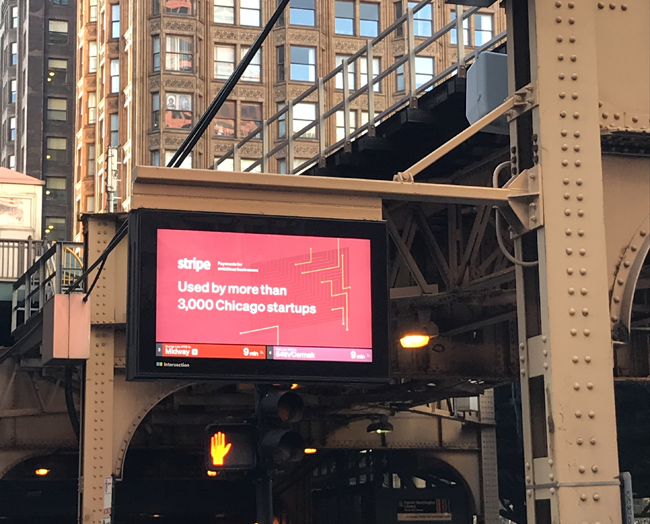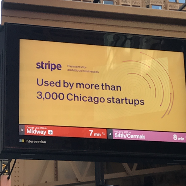 Stripe, the software platform for adding payments capabilities to ecommerce stores, is advertising throughout Chicago’s financial district on both street ad kiosks and Chicago Transit Authority El train platforms. It’s the first B2B payments advertising I’ve seen outside of a payments or FinTech conference.